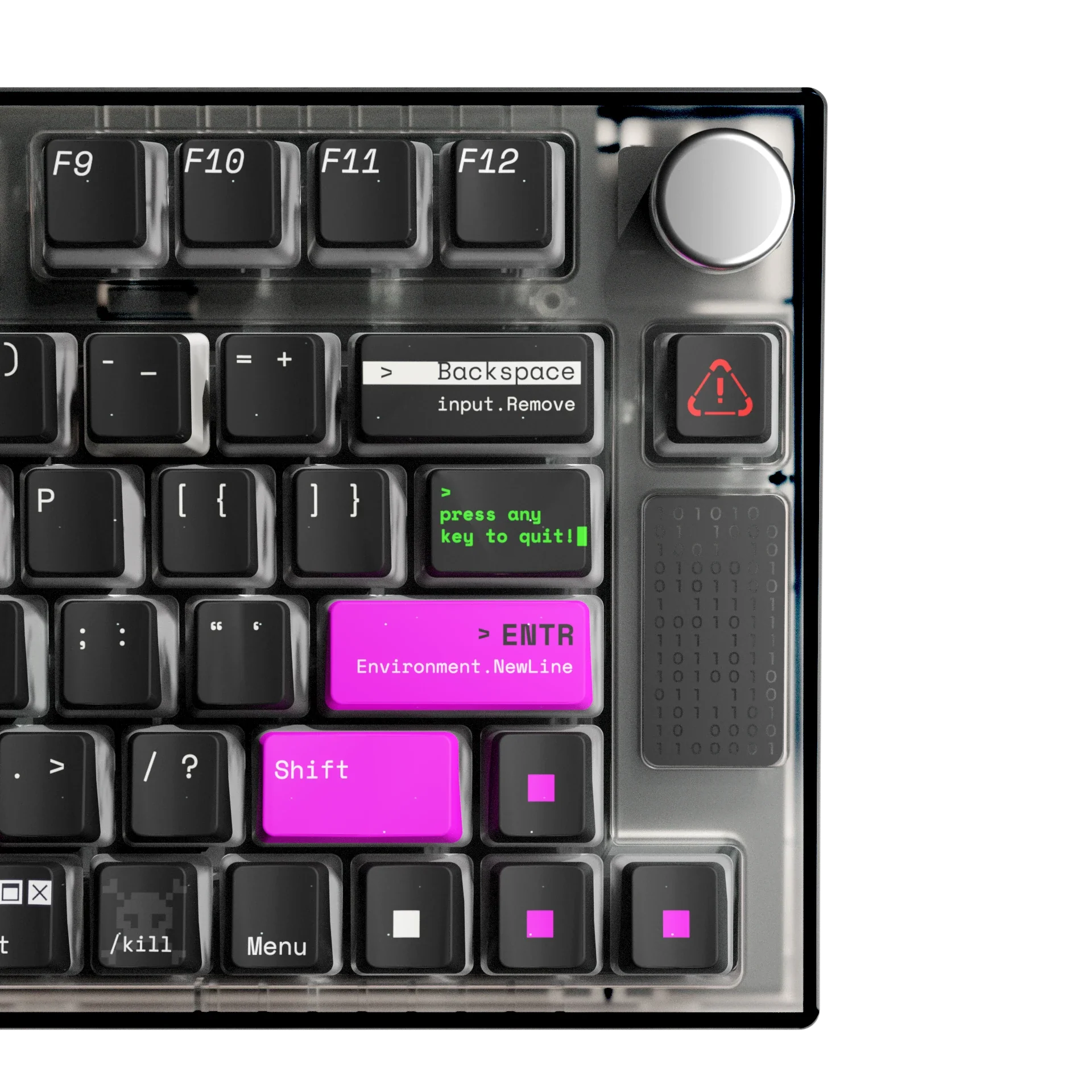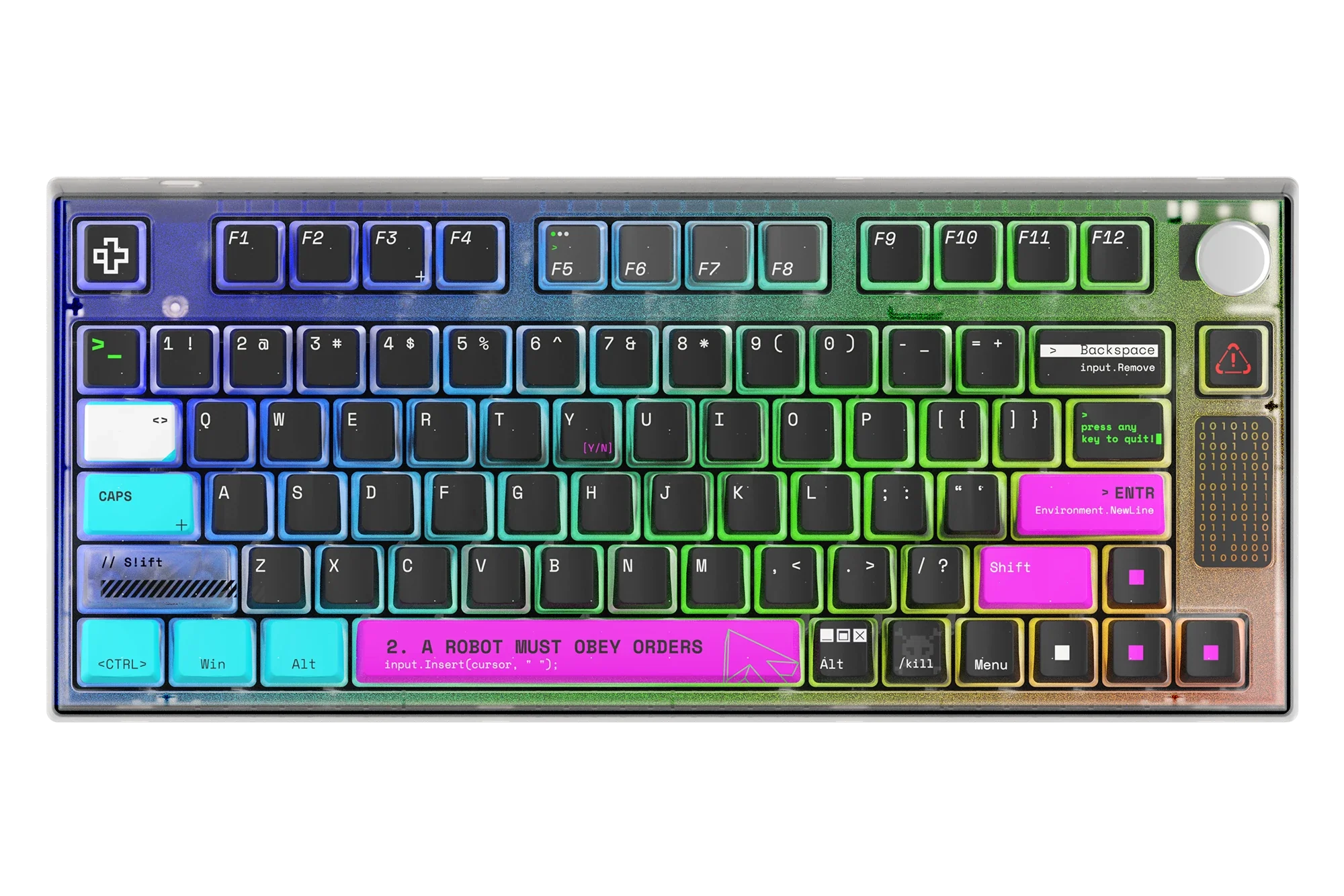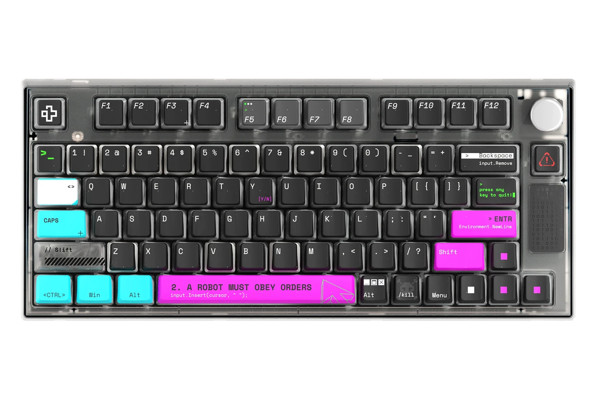 QwertyKey75 е дизайн, вдъхновен от технологията и изкуствения интелект, с черни keycaps и ярки акценти в розово и синьо. Тематични съобщения като „Роботът трябва да изпълнява заповеди“ и високотехнологични символи допълват естетиката. Прозрачната обвивка и RGB осветлението добавят модерен и динамичен ефект, перфектен за любителите на sci-fi и иновации.