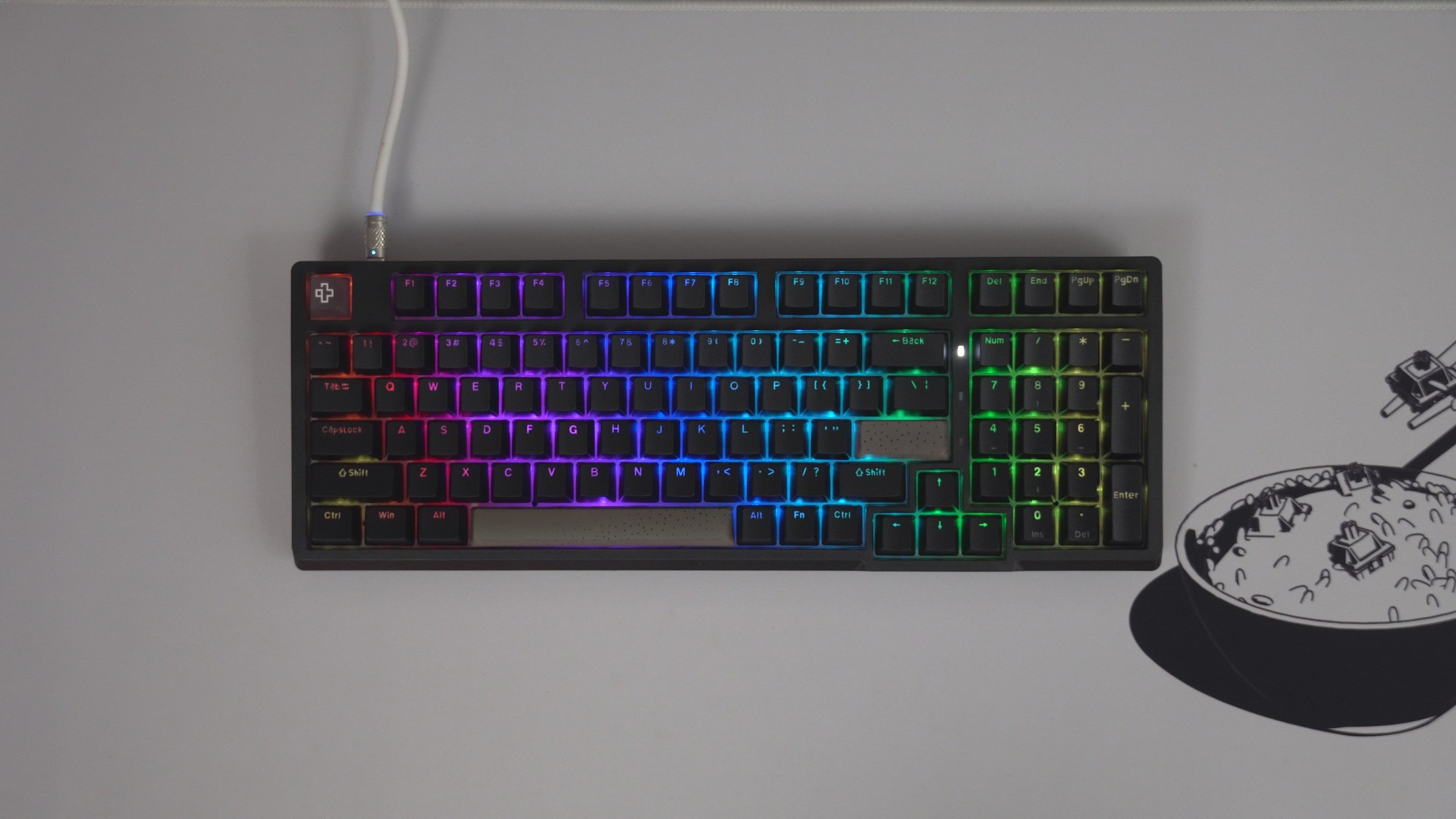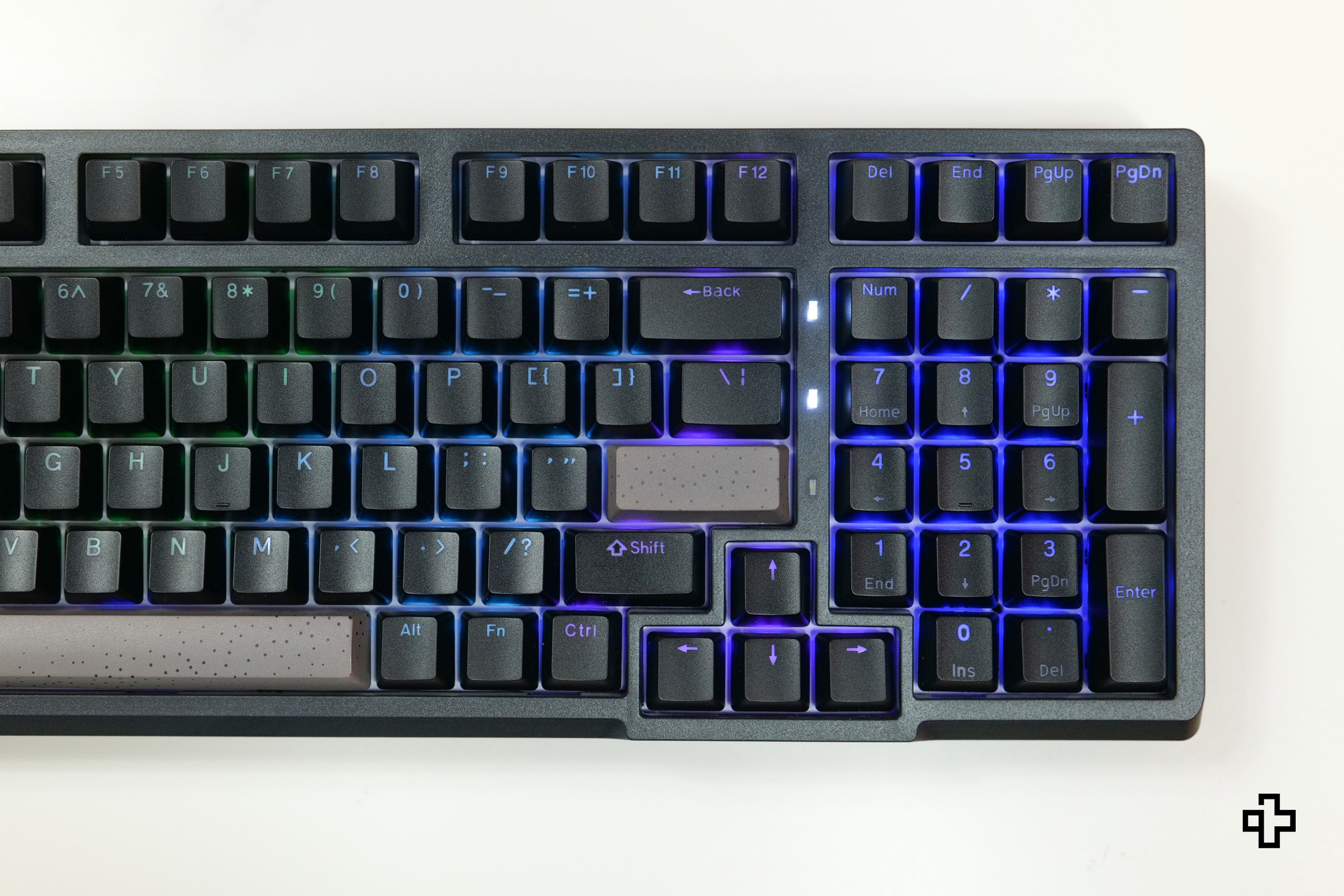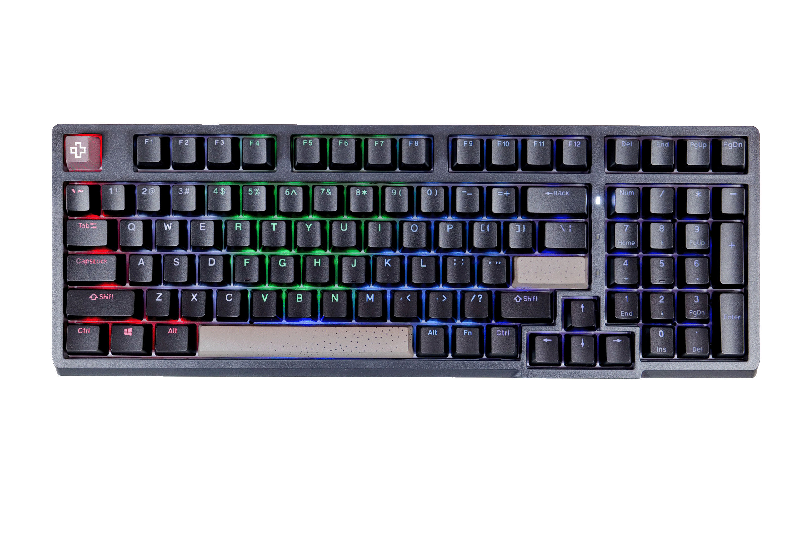Die Tastatur hat ein Layout mit 98 Tasten und bietet vollständige Funktionalität in einem kompakten Format, mit speziellen Tasten für Zahlen und wesentliche Funktionen, ideal für Benutzer, die Effizienz bevorzugen. -