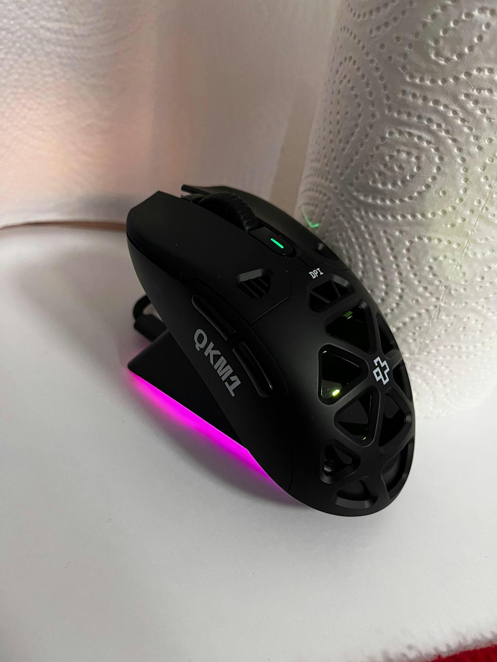 Mouse-ul include un charging dock care iti permite sa incarci mouse-ul mai usor, si care are si functia de dongle wireless. El iti permite sa vizualizezi si nivelul bateriei si al DPI-ului.