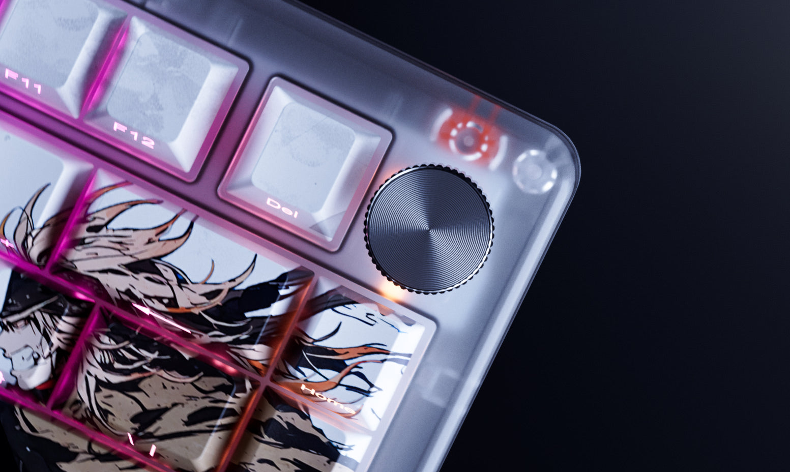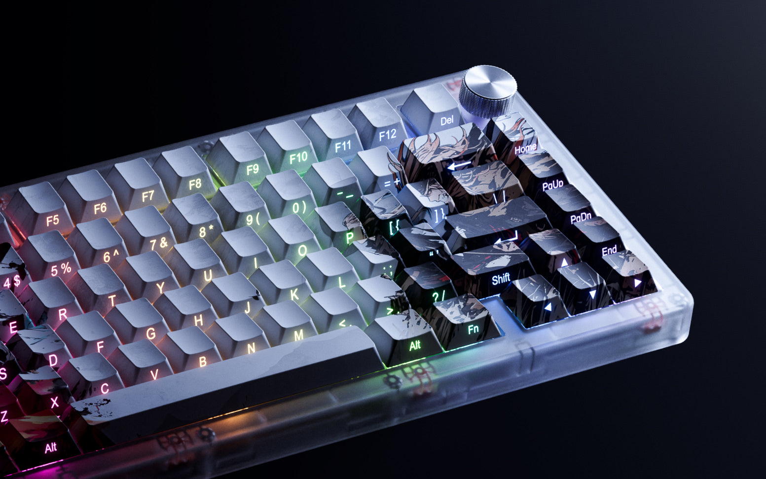 L'éclairage RGB est orienté vers le sud (vers l'utilisateur), offrant ainsi une compatibilité maximale avec tout type de keycaps et un effet visuel uniforme. Les couleurs peuvent être entièrement personnalisées, et les effets lumineux sont fluides, clairs et élégants – sans ombres ni interférences.