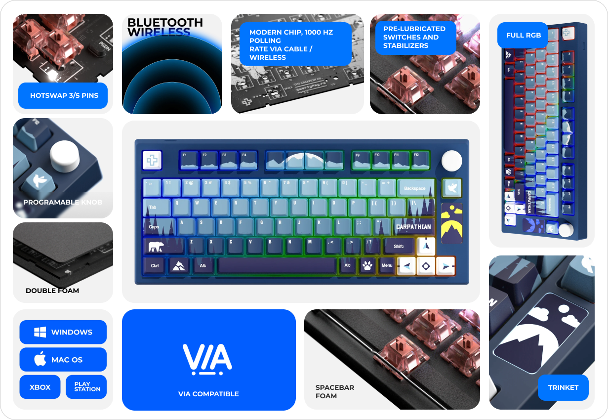 QwertyKey75 Carpathian présente un design élégant inspiré des Monts Carpates, avec des keycaps dans des nuances de bleu illustrant des paysages montagneux, des forêts et des animaux sauvages. Le boîtier bleu complet est mis en valeur par un éclairage RGB subtil, offrant un aspect moderne et raffiné. Idéal pour les passionnés de nature et d'esthétique minimaliste.