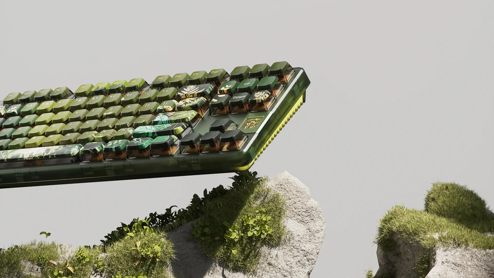 Het toetsenbord QK80 Leaf harmoniseert met het natuurlijke thema, met toetsen die zijn omhuld in groene tinten en bedrukt met bladerenmotieven. Elke toetsaanslag lijkt je dichter bij de natuur te brengen, zelfs op je bureau.