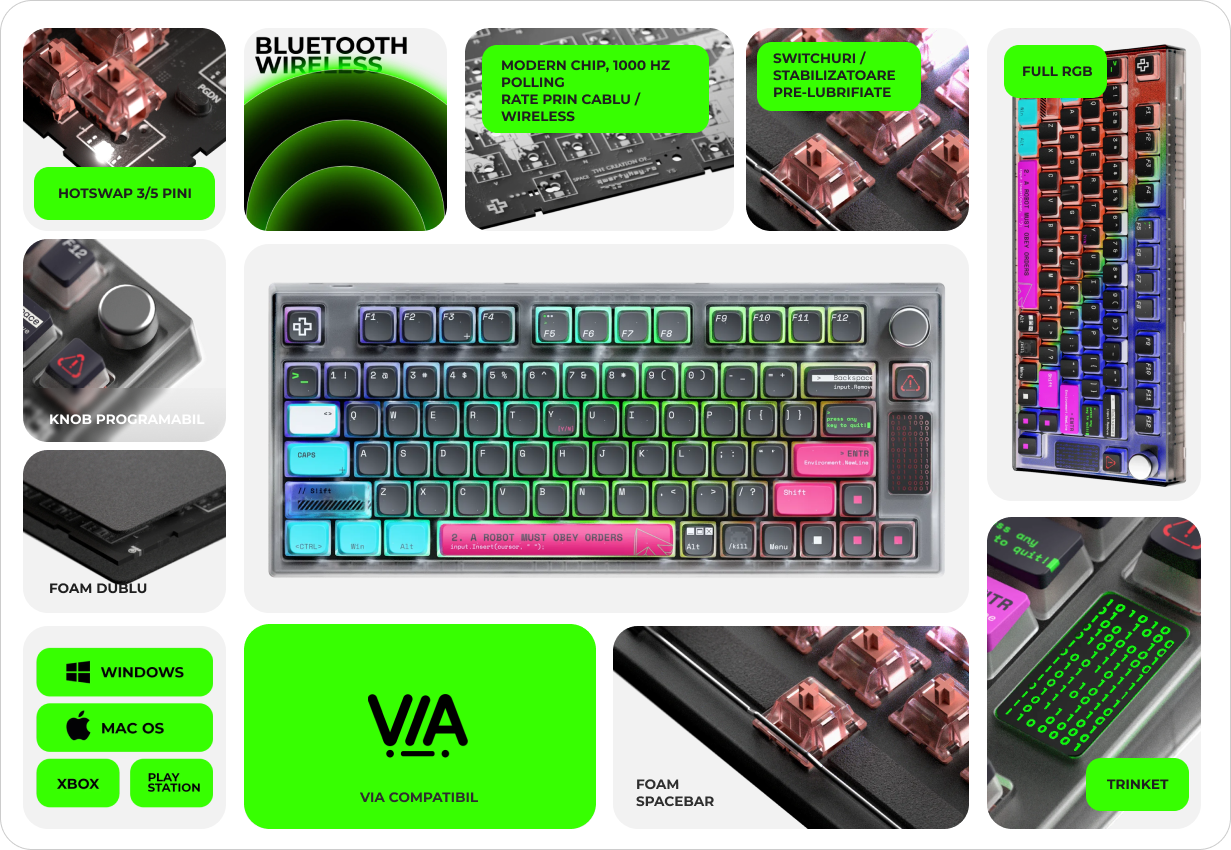 QwertyKey75 features a design inspired by technology and artificial intelligence, with black keycaps and vibrant pink and blue accents. Thematic messages such as "A robot must obey orders" and high-tech symbols complete the aesthetic. The transparent case and RGB lighting add a modern and dynamic effect, perfect for sci-fi and innovation enthusiasts.